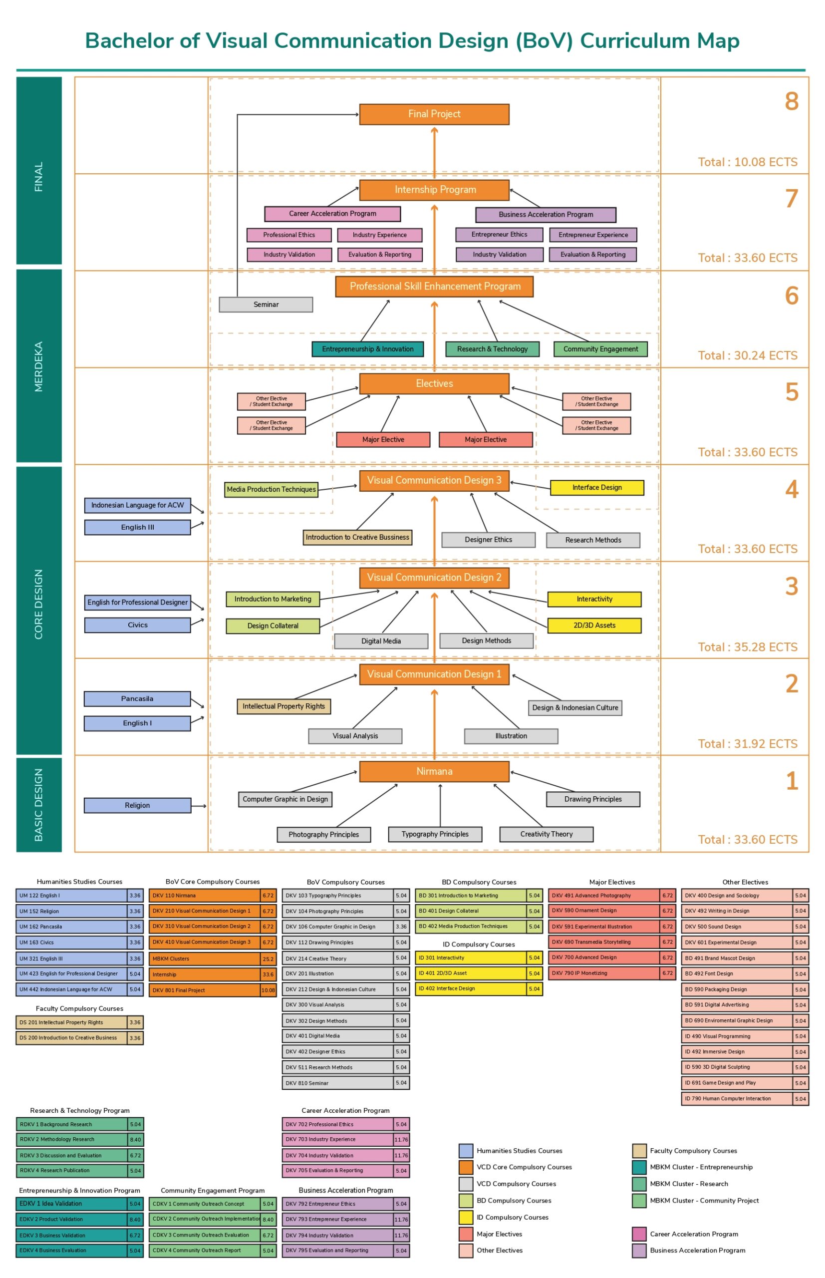 The Visual Communication Design Study Program consists of 2 (two) focuses: Visual Brand Design and Interaction Design. The undergraduate study load is minimum credit 144 (SKS) or 241,92 (ECTS), with a curriculum of 8 semesters, duration between 7 to 14 semesters.
